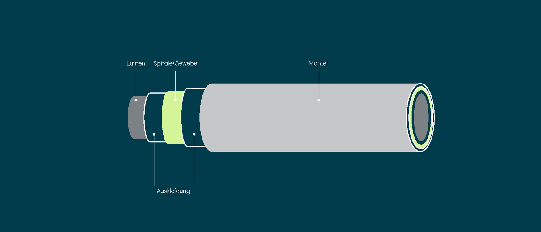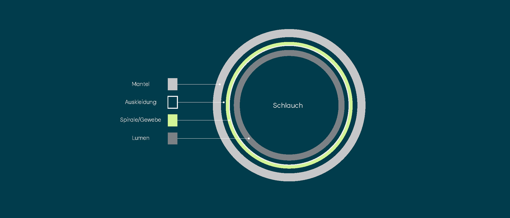 Ein Schlauch besteht aus vier Hauptkomponenten: dem Lumen, der Auskleidung, der Spirale und der Ummantelung. Jede dieser vier Schichten erfüllt eine eigene Funktion und ist für die Gesamtfunktionalität des Schlauchsystems unverzichtbar.